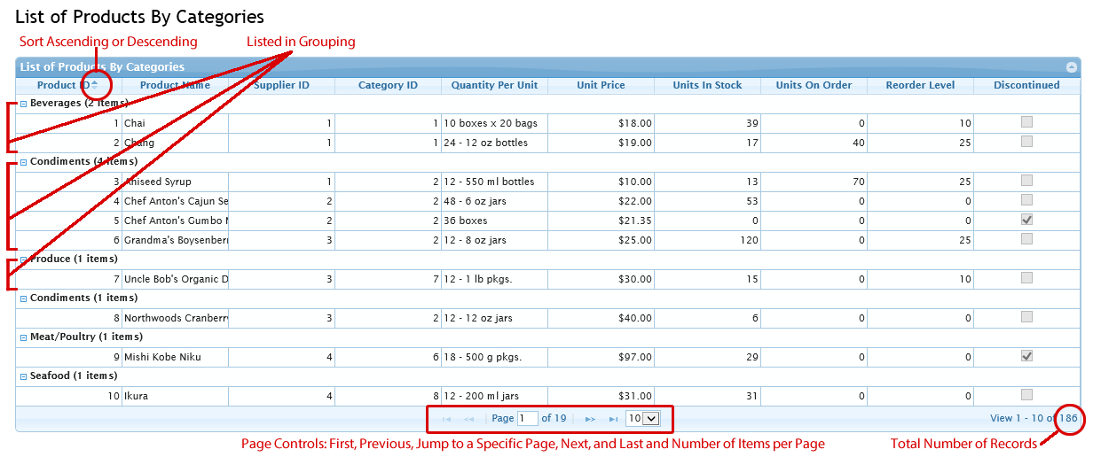 A view with a list of grouped items (e.g. Employees by DepartmentID). No CRUD functionality.